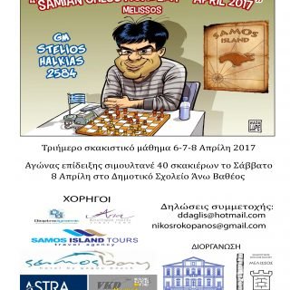 Ο GM Στέλιος Χαλκιάς και πάλι κοντά μας. Στις 6, 7 και 8 Απρίλη θα βρίσκεται στην Σάμο για ένα τριήμερο εκπαιδευτικό πρόγραμμα το οποίο θα κορυφωθεί το Σάββατο 8 Απρίλη με την διεξαγωγή Σιμουλτανέ στο Δημοτικό Σχολείο Άνω Βαθέος. Αξίζει να σημειωθεί ότι ο 36 ετών Στέλιος Xαλκιάς είναι Διεθνής Μετρ από το 1998 και Γκραν Μετρ από το...
