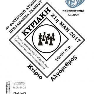 ΠΡΟΚΗΡΥΞΗ: Ο Σκακιστικός Όμιλος Σάμου «Μέλισσος» προκηρύσσει το 4ο Φοιτητικό Ατομικό Σκακιστικό Πρωτάθλημα Σάμου «Άλαν Τιούρινγκ». ΔΙΟΡΓΑΝΩΣΗ ΑΓΩΝΩΝ: Τους αγώνες συνδιοργανώνουν η Σκακιστική Φοιτητική Ομάδα της Σχολής Θετικών Επιστημών του Πανεπιστημίου Αιγαίου και ο Σκακιστικός Όμιλος Σάμου «Μέλισσος». ΗΜΕΡΟΜΗΝΙΑ & ΧΩΡΟΣ ΑΓΩΝΩΝ: Οι αγώνες θα διεξαχθούν την Κυριακή 21 Μάη 2017 στο πρώην κτίριο της φοιτητικής λέσχης «Αλγόριθμος»...