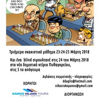 Για ακόμη μια χρονιά ο GM Stelios Halkias θα μας τιμήσει με την παρουσία του.Το Σάββατο 24 Μαρτίου 17.00 θα διοργανωθεί αγώνας επίδειξης “τυφλού Σκάκι” στο Νέο Δημοτικό Κτίριο Πυθαγορείου. Είσοδος Ελεύθερη για όλους τους φίλους του αθλήματος. Την Παρασκευή 23 & την Κυριακή 25 Μαρτίου (17:00) στο χώρο του συλλόγου στο Βαθύ (Μανιάκειο Κτίριο- Πλησίον Νοσοκομείου) θα παραδοθεί σκακιστικό 4 ωρο...