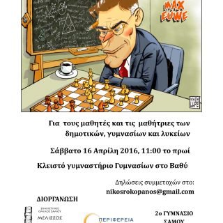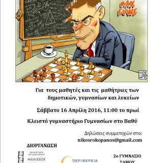 ΠΡΟΚΗΡΥΞΗ: Ο Σκακιστικός Όμιλος Σάμου «Μέλισσος» προκηρύσσει το 4ο Σκακιστικό Ατομικό Σχολικό Πρωτάθλημα Σάμου 2016. ΔΙΟΡΓΑΝΩΣΗ ΑΓΩΝΩΝ: Τους αγώνες διοργανώνουν ο Σκακιστικός Όμιλος Σάμου «Μέλισσος» σε συνεργασία με το 2ο Γυμνάσιο Σάμου, τις σκακιστικές ομάδες των σχολείων: «Μαυρογένειο» ΕΠΑΛ Σάμου, 2ο Γυμνάσιο Σάμου, Γυμνάσιο Μαραθοκάμπου και την Περιφέρεια Βορείου Αιγαίου υπό την αιγίδα της Τοπικής Επιτροπής Σκακιστικών Σωματείων Αιγαίου της...