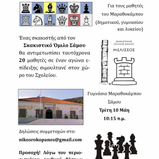 Ένα διαφορετικό σκακιστικό δρώμενο πραγματοποιήθηκε την Τρίτη 10 Μάη στο Γυμνάσιο Μαραθοκάμπου. Με την ευκαιρία της λήξης των μαθημάτων της φετινής σχολικής χρονιάς και της παρουσίασης των σχολικών προγραμμάτων οι μαθητές του Γυμνασίου και μέλη της σχολικής σκακιστικής λέσχης «Μαραθόσποροι» συμμετείχαν σε έναν σκακιστικό αγώνα επίδειξης «σιμουλτανέ» στον οποίο αντιμετώπισαν ταυτόχρονα τον αναπληρωτή καθηγητή του Τμήματος Μαθηματικών του Πανεπιστημίου Αιγαίου...