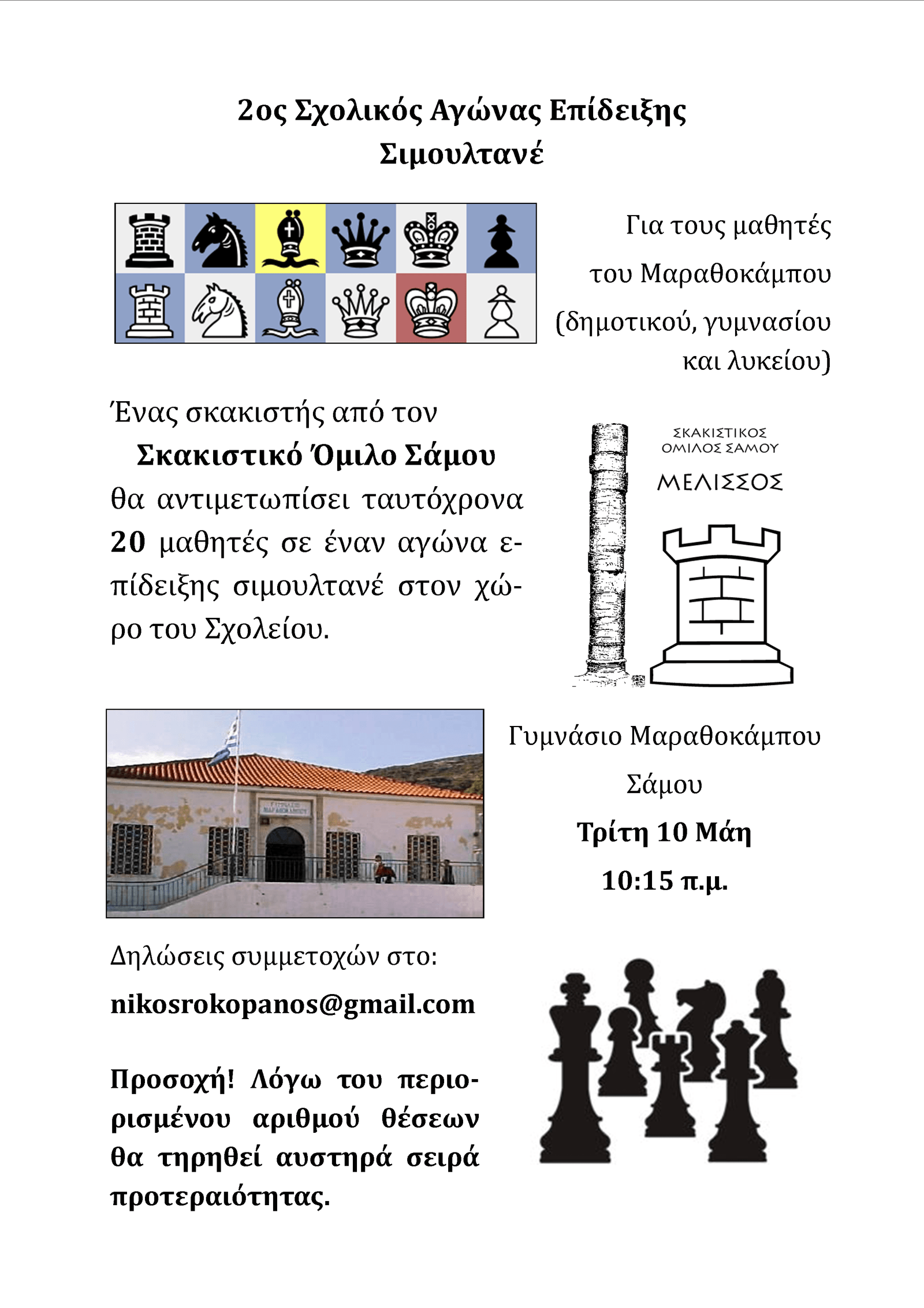 Με την ευκαιρία της λήξης των μαθημάτων της φετινής σχολικής χρονιάς και της παρουσίασης των σχολικών προγραμμάτων οι μαθητές του Γυμνασίου και μέλη της σχολικής σκακιστικής λέσχης «Μαραθόσποροι» συμμετείχαν σε έναν σκακιστικό αγώνα επίδειξης «σιμουλτανέ» στον οποίο αντιμετώπισαν ταυτόχρονα τον αναπληρωτή καθηγητή του Τμήματος Μαθηματικών του Πανεπιστημίου Αιγαίου και πρόεδρο του Σκακιστικού Ομίλου Σάμου κ. Αντώνη Τσολομύτη.